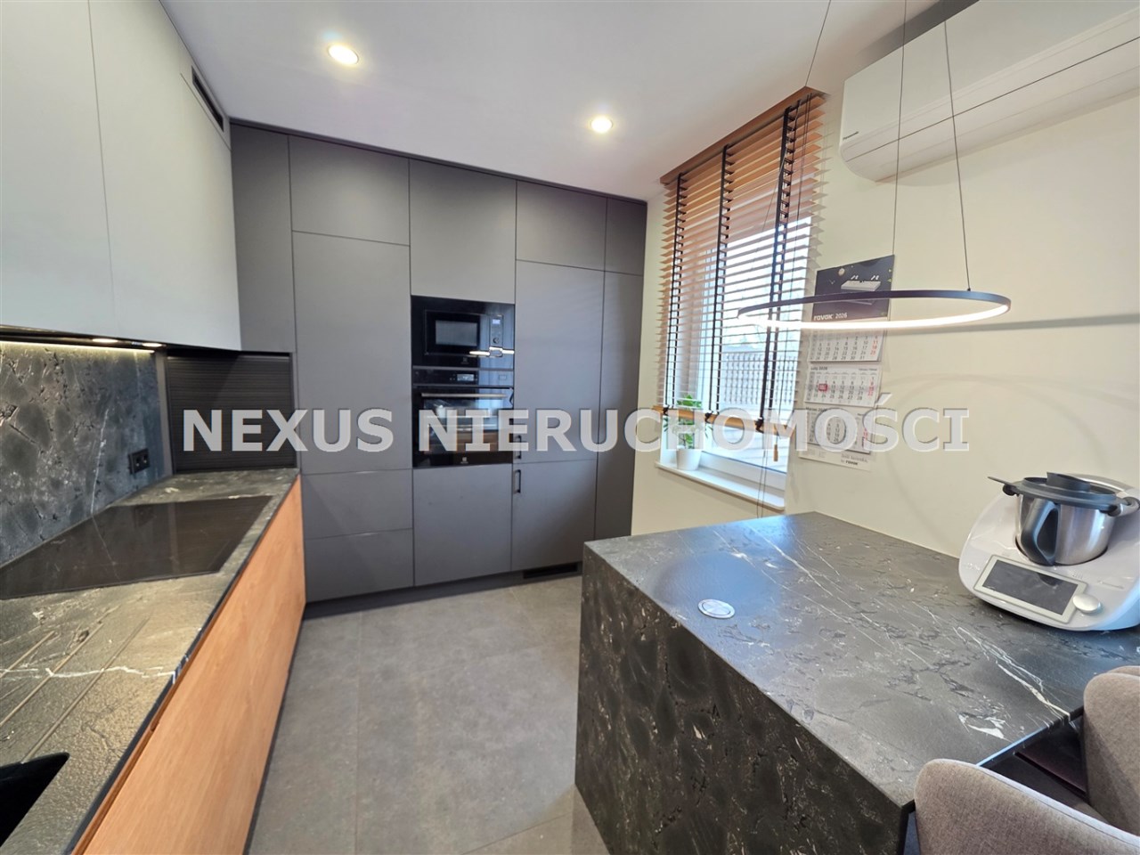 - zabudowa kuchenna wraz ze sprzętem AGD. Meble z plyty EGGER z powierzchnią Anti-finger. Fronty fornirowane z naturalnego drewna. Osprzęt Elektrolux (zmywarka XL, piekarnik parowy z sondą temperatury, okap, lodówka XL, mikrofala), zlew granitowy FRANKE, bateria zlewowa GROHE. Blaty HODER z granitu naturalnego. Wyspa z oświetleniem LED.